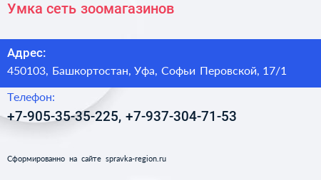 Умка, сеть зоомагазинов по адресу 450103, Башкортостан, Уфа, Софьи Перовской, 17/1 в дальнейшем Организация, размещена в следующих категориях: