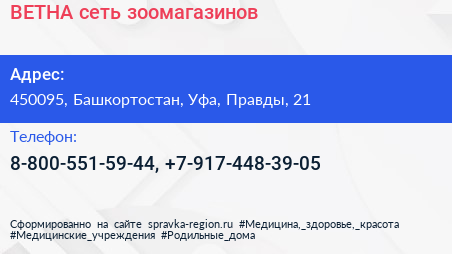 ВЕТНА, сеть зоомагазинов по адресу 450095, Башкортостан, Уфа, Правды, 21 в дальнейшем Организация, размещена в следующих категориях: