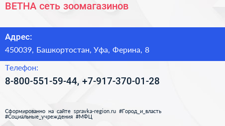 ВЕТНА, сеть зоомагазинов по адресу 450039, Башкортостан, Уфа, Ферина, 8 в дальнейшем Организация, размещена в следующих категориях: