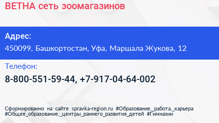 ВЕТНА, сеть зоомагазинов по адресу 450099, Башкортостан, Уфа, Маршала Жукова, 12 в дальнейшем Организация, размещена в следующих категориях: