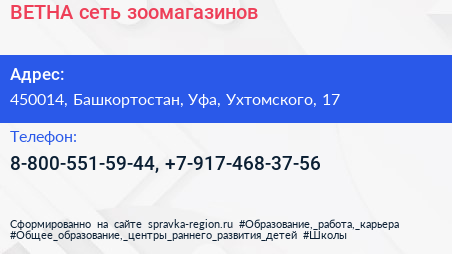 ВЕТНА, сеть зоомагазинов по адресу 450014, Башкортостан, Уфа, Ухтомского, 17 в дальнейшем Организация, размещена в следующих категориях: