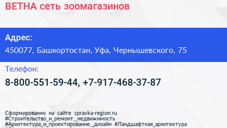 ВЕТНА, сеть зоомагазинов по адресу 450077, Башкортостан, Уфа, Чернышевского, 75 в дальнейшем Организация, размещена в следующих категориях: