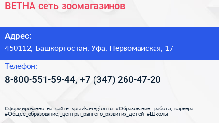 ВЕТНА, сеть зоомагазинов по адресу 450112, Башкортостан, Уфа, Первомайская, 17 в дальнейшем Организация, размещена в следующих категориях: