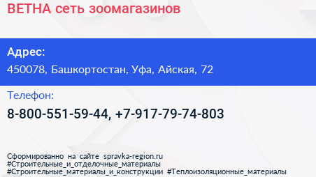ВЕТНА, сеть зоомагазинов по адресу 450078, Башкортостан, Уфа, Айская, 72 в дальнейшем Организация, размещена в следующих категориях: