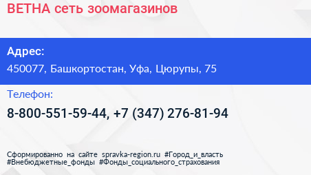 ВЕТНА, сеть зоомагазинов по адресу 450077, Башкортостан, Уфа, Цюрупы, 75 в дальнейшем Организация, размещена в следующих категориях: