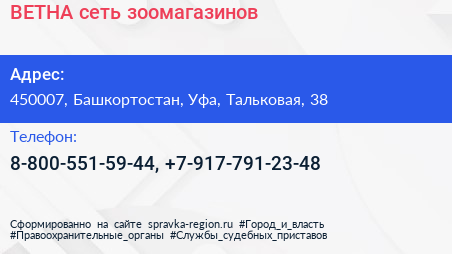 ВЕТНА, сеть зоомагазинов по адресу 450007, Башкортостан, Уфа, Тальковая, 38 в дальнейшем Организация, размещена в следующих категориях: