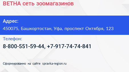 ВЕТНА, сеть зоомагазинов по адресу 450075, Башкортостан, Уфа, проспект Октября, 123 в дальнейшем Организация, размещена в следующих категориях: