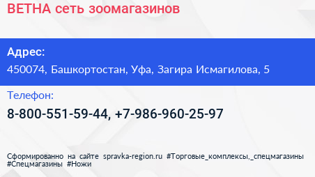 ВЕТНА, сеть зоомагазинов по адресу 450074, Башкортостан, Уфа, Загира Исмагилова, 5 в дальнейшем Организация, размещена в следующих категориях: