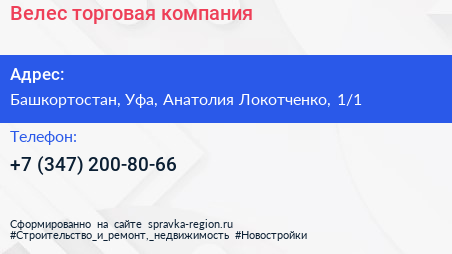 Велес, торговая компания по адресу Башкортостан, Уфа, Анатолия Локотченко, 1/1 в дальнейшем Организация, размещена в следующих категориях: