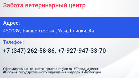Забота, ветеринарный центр по адресу 450039, Башкортостан, Уфа, Глинки, 4а в дальнейшем Организация, размещена в следующих категориях: