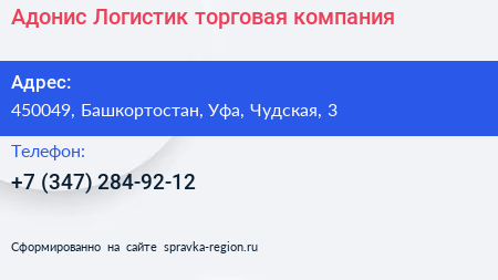 Адонис-Логистик, торговая компания по адресу 450049, Башкортостан, Уфа, Чудская, 3 в дальнейшем Организация, размещена в следующих категориях: