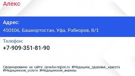 Алекс по адресу 450106, Башкортостан, Уфа, Рабкоров, 8/1 в дальнейшем Организация, размещена в следующих категориях: