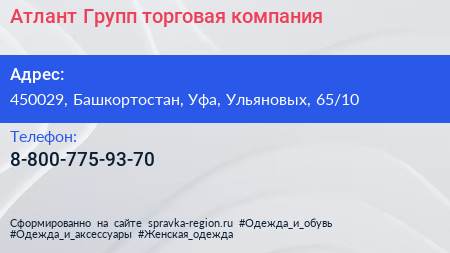 Атлант Групп, торговая компания по адресу 450029, Башкортостан, Уфа, Ульяновых, 65/10 в дальнейшем Организация, размещена в следующих категориях: