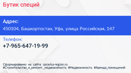 Бутик специй по адресу 450104, Башкортостан, Уфа, улица Российская, 147 в дальнейшем Организация, размещена в следующих категориях: