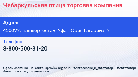 Чебаркульская птица, торговая компания по адресу 450099, Башкортостан, Уфа, Юрия Гагарина, 9 в дальнейшем Организация, размещена в следующих категориях: