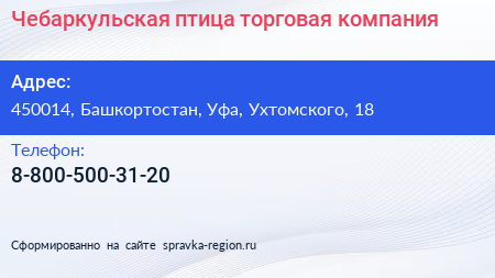 Чебаркульская птица, торговая компания по адресу 450014, Башкортостан, Уфа, Ухтомского, 18 в дальнейшем Организация, размещена в следующих категориях: