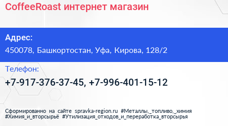 CoffeeRoast, интернет-магазин по адресу 450078, Башкортостан, Уфа, Кирова, 128/2 в дальнейшем Организация, размещена в следующих категориях: