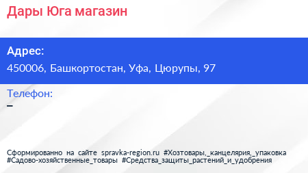 Дары Юга, магазин по адресу 450006, Башкортостан, Уфа, Цюрупы, 97 в дальнейшем Организация, размещена в следующих категориях: