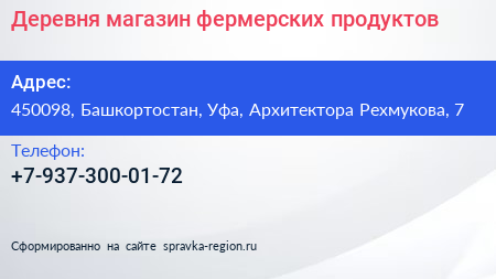 Деревня, магазин фермерских продуктов по адресу 450098, Башкортостан, Уфа, Архитектора Рехмукова, 7 в дальнейшем Организация, размещена в следующих категориях: