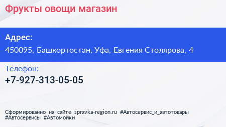 Фрукты-овощи, магазин по адресу 450095, Башкортостан, Уфа, Евгения Столярова, 4 в дальнейшем Организация, размещена в следующих категориях: