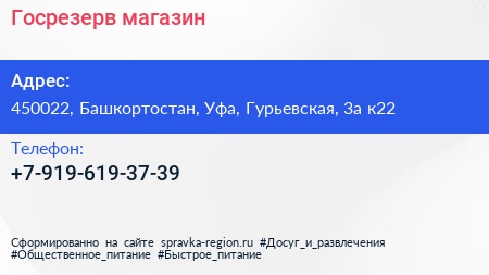 Госрезерв, магазин по адресу 450022, Башкортостан, Уфа, Гурьевская, 3а к22 в дальнейшем Организация, размещена в следующих категориях: