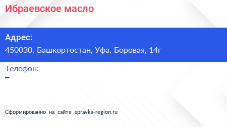 Ибраевское масло по адресу 450030, Башкортостан, Уфа, Боровая, 14г в дальнейшем Организация, размещена в следующих категориях: