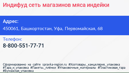 Индифуд, сеть магазинов мяса индейки по адресу 450061, Башкортостан, Уфа, Первомайская, 68 в дальнейшем Организация, размещена в следующих категориях: