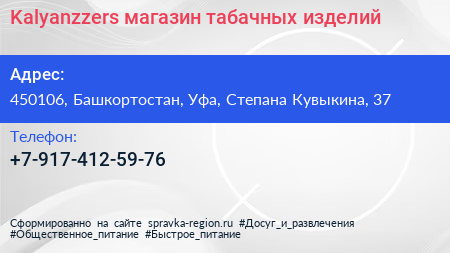 Kalyanzzers, магазин табачных изделий по адресу 450106, Башкортостан, Уфа, Степана Кувыкина, 37 в дальнейшем Организация, размещена в следующих категориях: