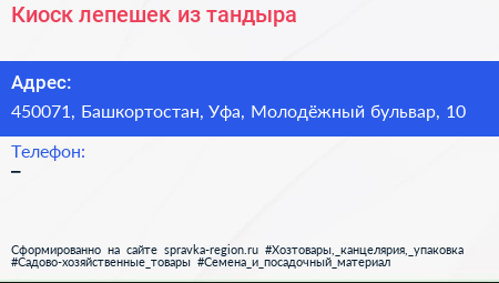 Киоск лепешек из тандыра по адресу 450071, Башкортостан, Уфа, Молодёжный бульвар, 10 в дальнейшем Организация, размещена в следующих категориях: