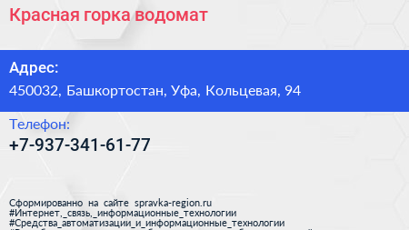 Красная горка, водомат по адресу 450032, Башкортостан, Уфа, Кольцевая, 94 в дальнейшем Организация, размещена в следующих категориях: