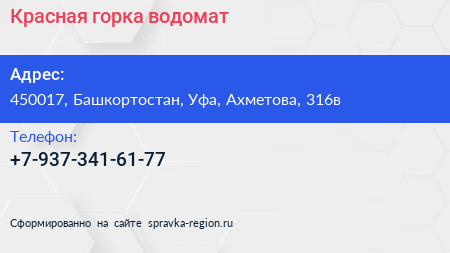 Красная горка, водомат по адресу 450017, Башкортостан, Уфа, Ахметова, 316в в дальнейшем Организация, размещена в следующих категориях: