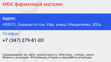 МБК, фирменный магазин по адресу 450071, Башкортостан, Уфа, улица Менделеева, 205а в дальнейшем Организация, размещена в следующих категориях: