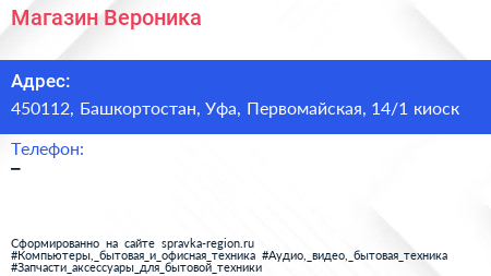 Магазин Вероника по адресу 450112, Башкортостан, Уфа, Первомайская, 14/1 киоск в дальнейшем Организация, размещена в следующих категориях: