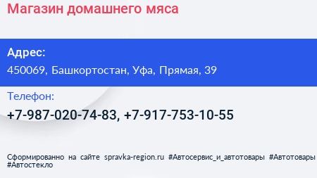 Магазин домашнего мяса по адресу 450069, Башкортостан, Уфа, Прямая, 39 в дальнейшем Организация, размещена в следующих категориях: