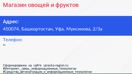Магазин овощей и фруктов по адресу 450074, Башкортостан, Уфа, Муксинова, 2/3а в дальнейшем Организация, размещена в следующих категориях: