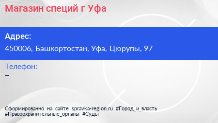 Магазин специй, г. Уфа по адресу 450006, Башкортостан, Уфа, Цюрупы, 97 в дальнейшем Организация, размещена в следующих категориях: