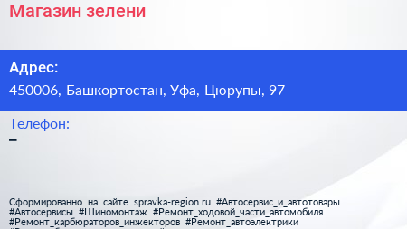 Магазин зелени по адресу 450006, Башкортостан, Уфа, Цюрупы, 97 в дальнейшем Организация, размещена в следующих категориях: