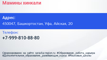 Мамины хинкали по адресу 450047, Башкортостан, Уфа, Айская, 20 в дальнейшем Организация, размещена в следующих категориях: