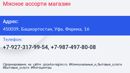 Мясное ассорти, магазин по адресу 450039, Башкортостан, Уфа, Ферина, 16 в дальнейшем Организация, размещена в следующих категориях: