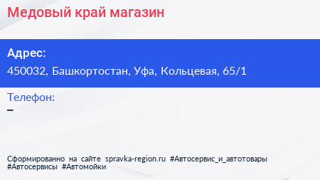 Медовый край, магазин по адресу 450032, Башкортостан, Уфа, Кольцевая, 65/1 в дальнейшем Организация, размещена в следующих категориях: