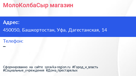 МолоКолбаСыр, магазин по адресу 450050, Башкортостан, Уфа, Дагестанская, 14 в дальнейшем Организация, размещена в следующих категориях: