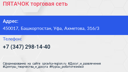 ПЯТАЧОК, торговая сеть по адресу 450017, Башкортостан, Уфа, Ахметова, 316/3 в дальнейшем Организация, размещена в следующих категориях: