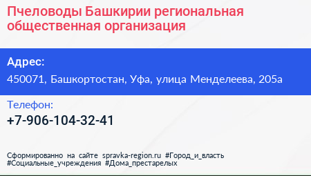 Пчеловоды Башкирии, региональная общественная организация по адресу 450071, Башкортостан, Уфа, улица Менделеева, 205а в дальнейшем Организация, размещена в следующих категориях:
