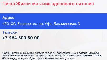 Пища Жизни, магазин здорового питания по адресу 450106, Башкортостан, Уфа, Бакалинская, 3 в дальнейшем Организация, размещена в следующих категориях: