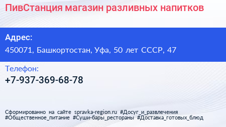 ПивСтанция, магазин разливных напитков по адресу 450071, Башкортостан, Уфа, 50 лет СССР, 47 в дальнейшем Организация, размещена в следующих категориях: