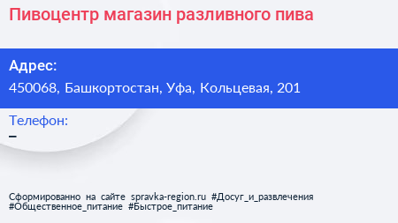 Пивоцентр, магазин разливного пива по адресу 450068, Башкортостан, Уфа, Кольцевая, 201 в дальнейшем Организация, размещена в следующих категориях: