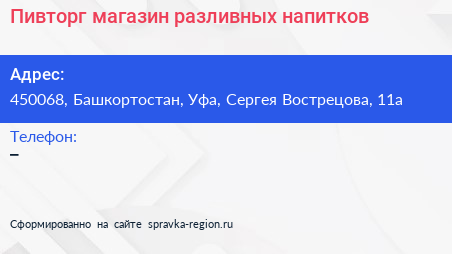 Пивторг, магазин разливных напитков по адресу 450068, Башкортостан, Уфа, Сергея Вострецова, 11а в дальнейшем Организация, размещена в следующих категориях: