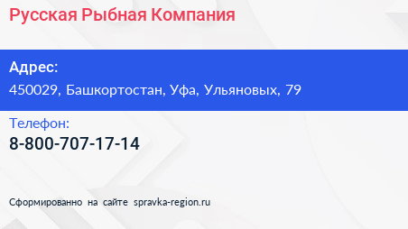 Русская Рыбная Компания по адресу 450029, Башкортостан, Уфа, Ульяновых, 79 в дальнейшем Организация, размещена в следующих категориях: