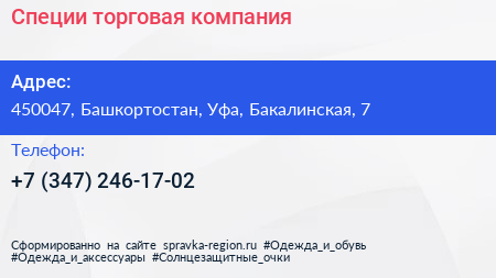 Специи, торговая компания по адресу 450047, Башкортостан, Уфа, Бакалинская, 7 в дальнейшем Организация, размещена в следующих категориях: