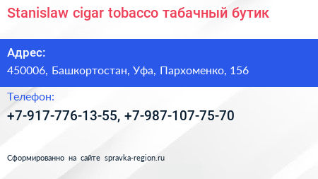 Stanislaw cigar & tobacco, табачный бутик по адресу 450006, Башкортостан, Уфа, Пархоменко, 156 в дальнейшем Организация, размещена в следующих категориях: